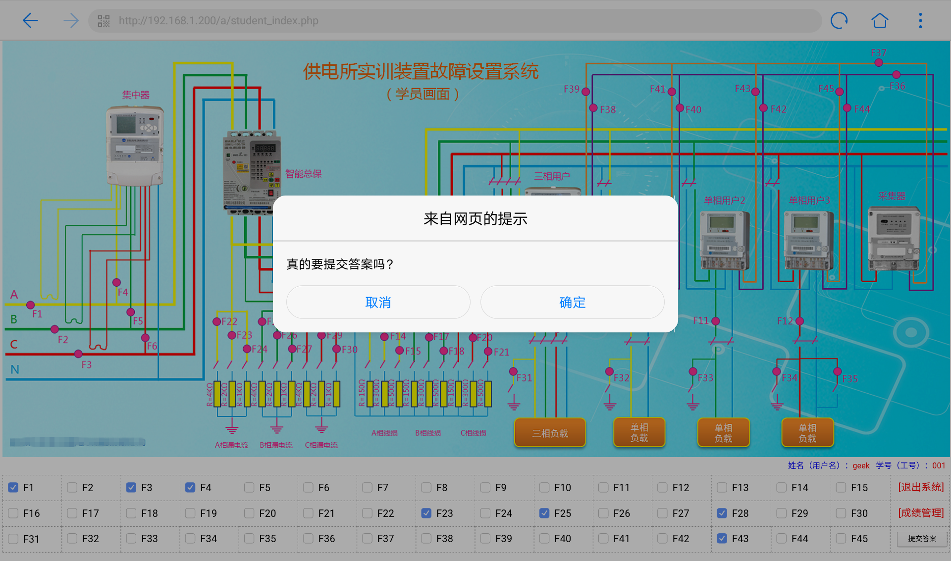 系統(tǒng)標(biāo)準(zhǔn)配置了漏電斷路器、電流電壓頻率數(shù)顯表、多檔轉(zhuǎn)換開關(guān)、電流互感器、電能表、采集器、集中器、智能總保、變壓器、接觸器、熱過載繼電器、時(shí)間繼電器、電機(jī)、啟動(dòng)停止、測試按鈕等。支持設(shè)置45個(gè)故障點(diǎn)。