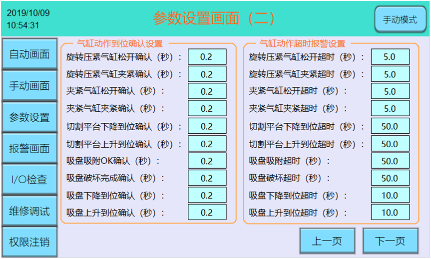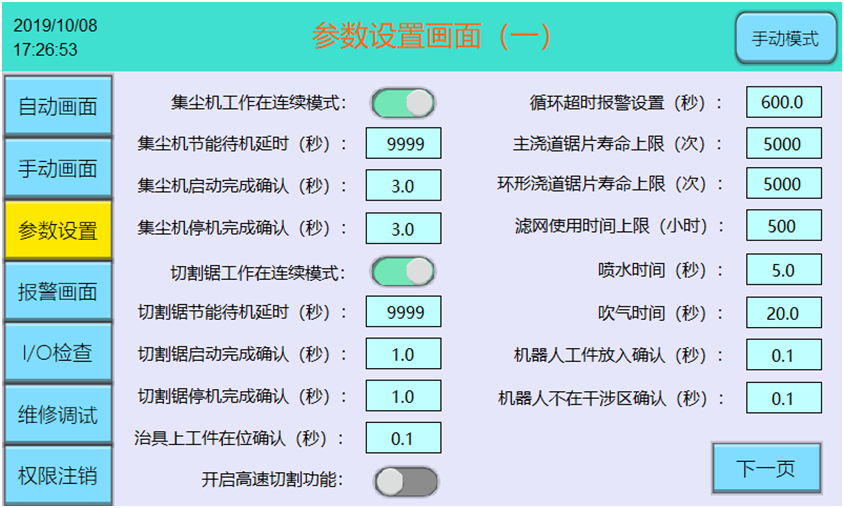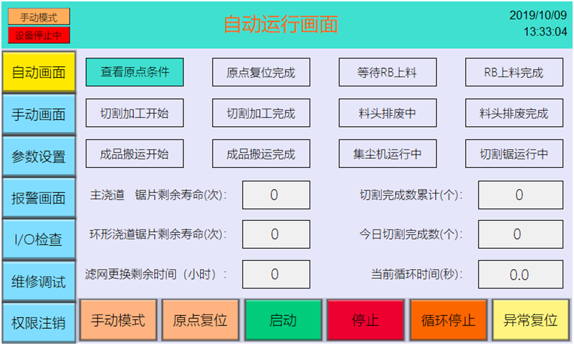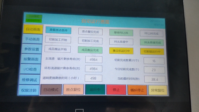 本設(shè)備支持自動、手動、參數(shù)設(shè)置、報警查詢、維修調(diào)試等操作,支持鋸片、集塵機濾網(wǎng)的壽命管理,支持長時間無切割作業(yè)時切割電機和集塵機電機自動節(jié)能待機,待有產(chǎn)品切割任務(wù)時自動啟動電機。