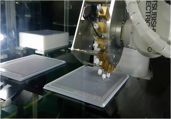 4、機(jī)器人根據(jù)空缺數(shù)和空缺位置,自動從滿盤中取出芯片并填補(bǔ)空缺。