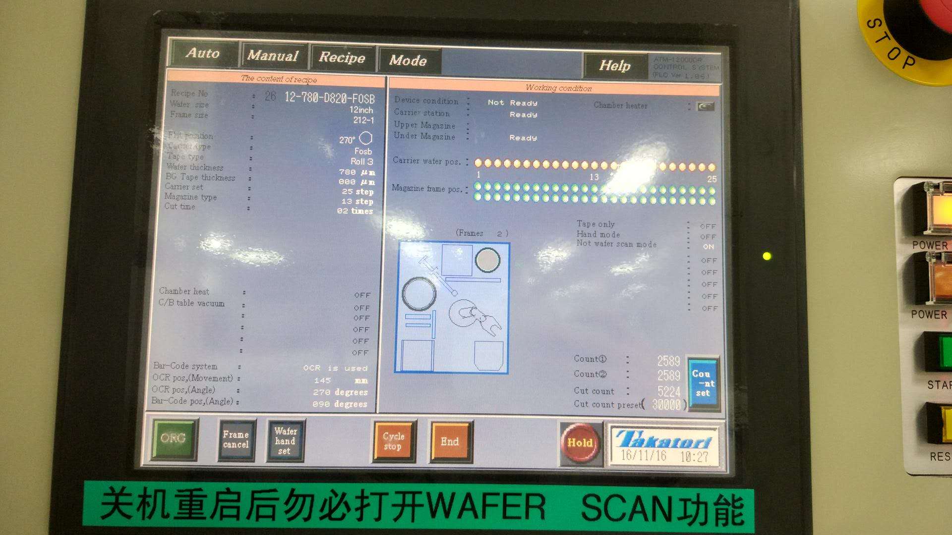 wafer mount設(shè)備改造升級,修改安川機器人及歐姆龍PLC程序,增加人工放晶圓歪斜導致停機后,防止回原點時機器人損壞晶圓的保護功能。